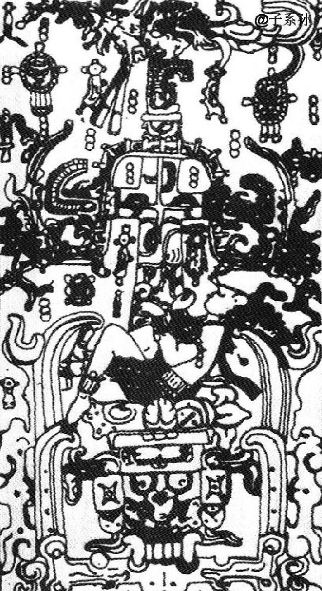 比如说下图这个“玛雅人宇航员浮雕”。浮雕中的玛雅人半躺着坐在一个容器之内,这个容器形状像一个马桶橛子,下面还在喷火,让人联想到了宇航员。
