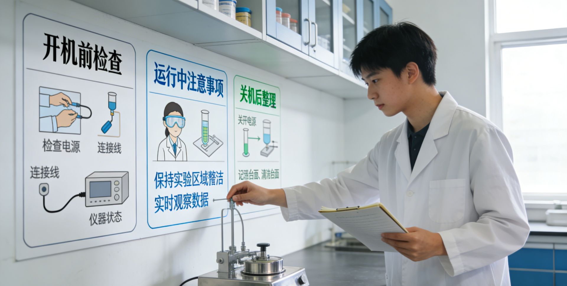 (二)规范操作流程,提升安全实操能力高校实验室是学生掌握专业实操技能的重要场景,部分学生因实操经验不足、对流程规范不熟悉,容易出现违规操作行为。目视化管理可将复杂的操作流程、仪器使用规范转化为图文并茂的流程图与操作指引贴,张贴于仪器设备旁、实验台显著位置,使师生无需查阅厚重手册,就能较快掌握操作步骤、关键注意事项及异常处置方向。例如,在天平、离心机、液相色谱仪等设备旁张贴标准化操作图示,明确“开机前检查项、运行中禁止行为、关机后整理规范”;在实验台张贴试剂取用、废液处理流程指引,细化不同试剂的专用取用工具、废液分类收集标准及注意事项。这种可视化指引不仅有助于规范操作行为,减少因操作失误引发的安全问题,也可能帮助学生逐步提升实操能力,养成相对严谨规范的实验习惯。