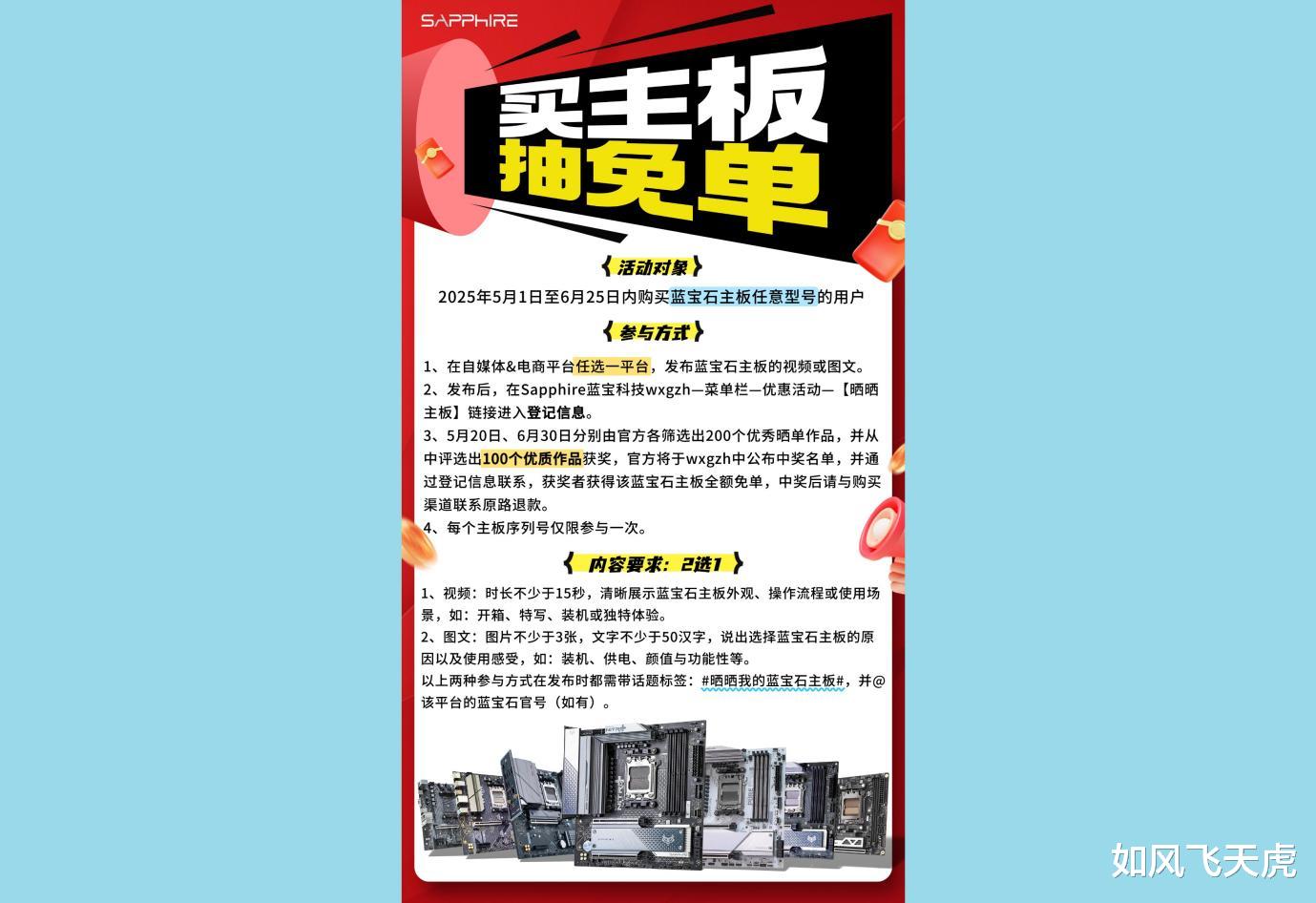 作为一线厂商,蓝宝石不仅有显卡,而且还有主板,性价比非常高。最近蓝宝石有买蓝宝石主板 抽免单活动,会送出高达100块主板哦!机会难得!只要是在2025年5月1日至6月25日内购买蓝宝石主板任意型号的用户均具有资格参加,具体规则请看下面的图片,建议同客服沟通详情。100块主板,获奖几率还是很大的哦,买买买吧。