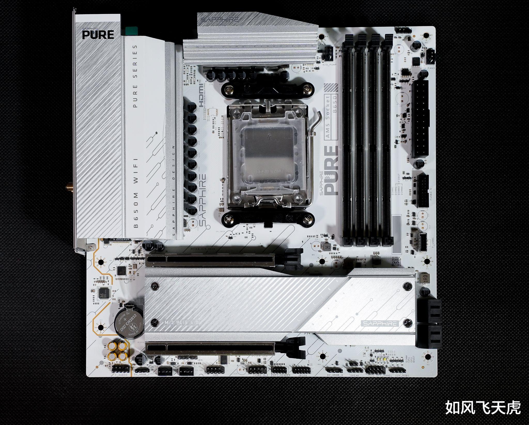 从上面的配置单里我们看到主板是蓝宝石PURE极地B650M WIFI,是的蓝宝石还有主板。这是款白色主板,M-ATX规格。主板的底色是白色的,白色的一体式IO,白色南桥和M.2插槽散热装甲,以及白色的CPU盖。装甲上面有着不同的条纹和文字,让主板整体生动而不单调。主板的供电很重要,这款主板采用了12+2+1 相供电设计,可以支撑顶级的AMD CPU 9950X和9950X3D也没有问题。一体式IO和VRM散热器采用了大面积的铝制极地散热片,褶皱式的设计,可以大大增加散热面积,提高散热能力。
