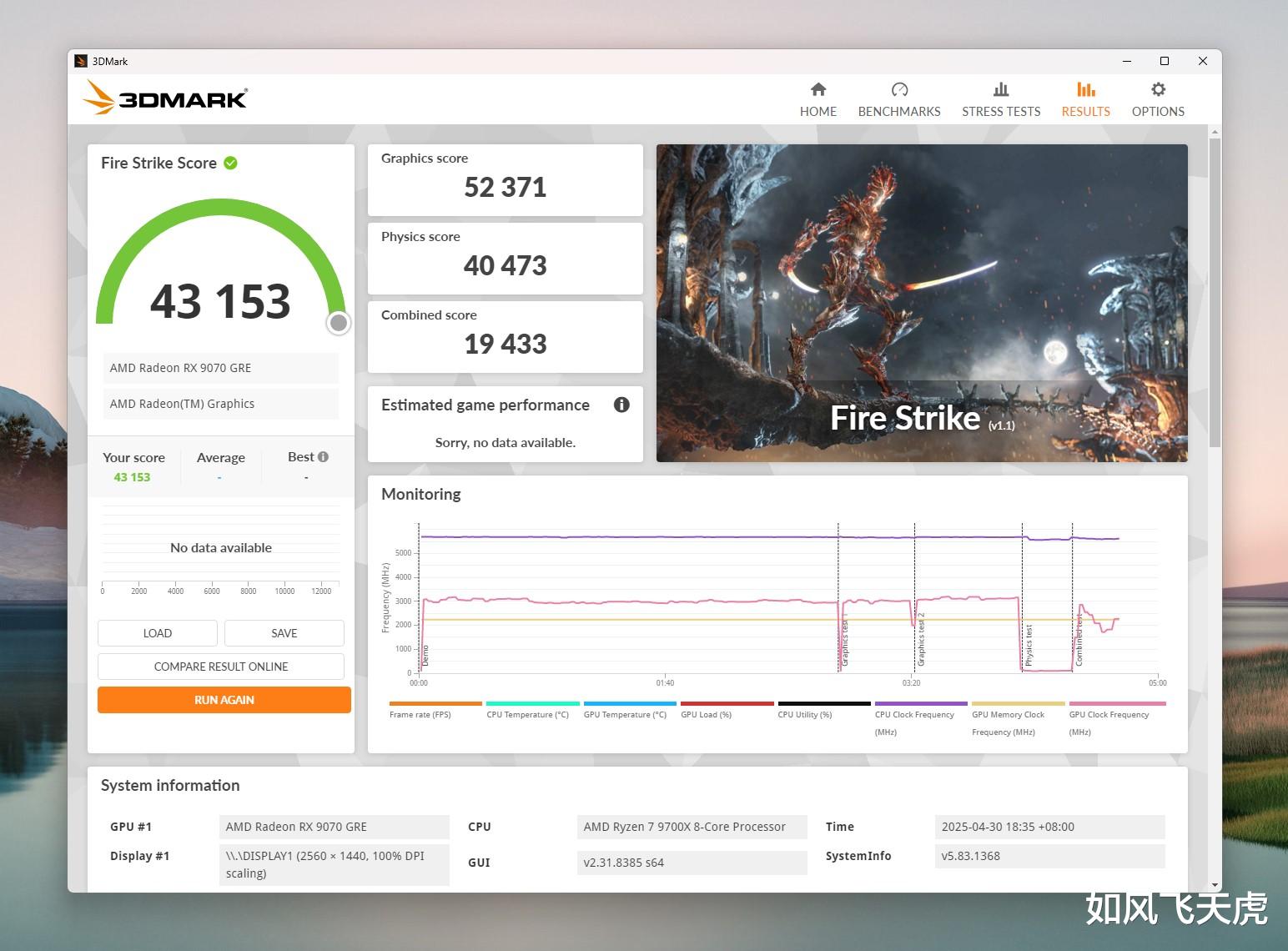 Fire Strike测试,总分43153。其中图形得分52371,而网上RTX 5070的评测成绩大多在50600-55500,两者互有高低。