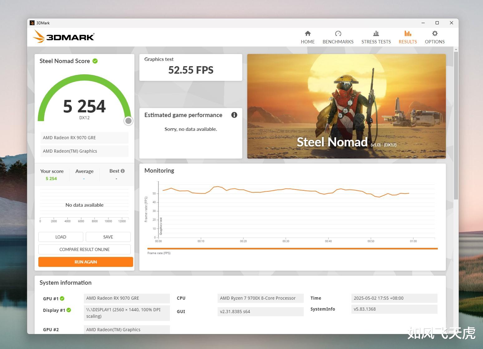 Steel Nomad测试,5254分。而从网上一些RTX 5070的评测看,RTX 5070这个项目的跑分在4900-5100之间,这一开始的测试项目,这款蓝宝石PURE极地RX 9070 GRE的表现就超过了RTX 5070。