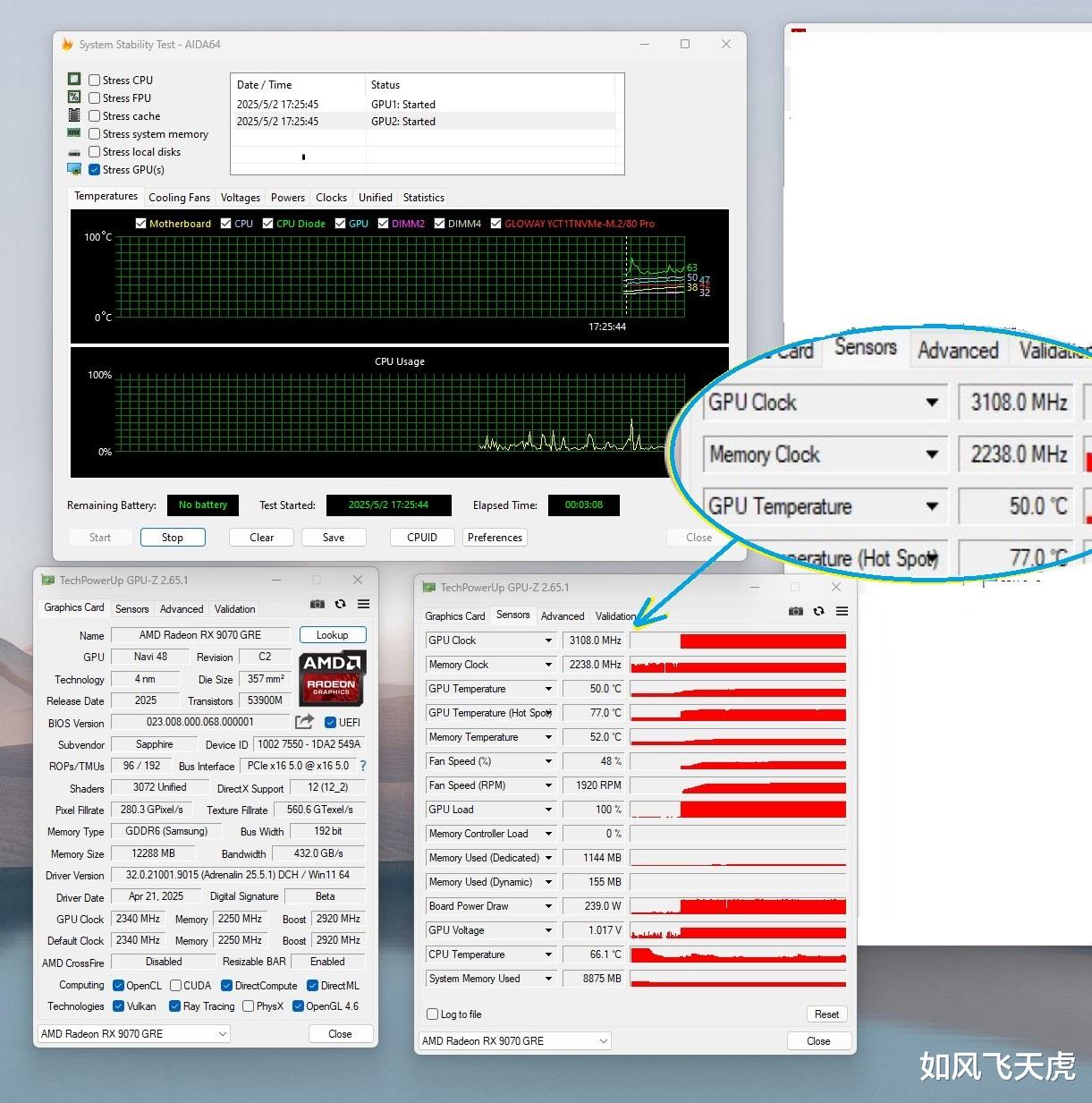 然后我们运行GPU-Z,看到这枚显卡的参数是96个ROPs,192个TMUs,工作在PCIe 5.0x16,具有3072个流处理器,DDDR6内存,12GB容量,192bit位宽,432GB/s带宽。需要注意的是这里的GPU游戏频率是2340MHz,加速频率是2920MHz,比起公布的2220MHz和2790MHz都要高一些,可以说默认就是超频版。运行AIDA64 GPU压力测试,我们看功耗239W,GPU温度50°C,结点温度77°C,表现十分不错。