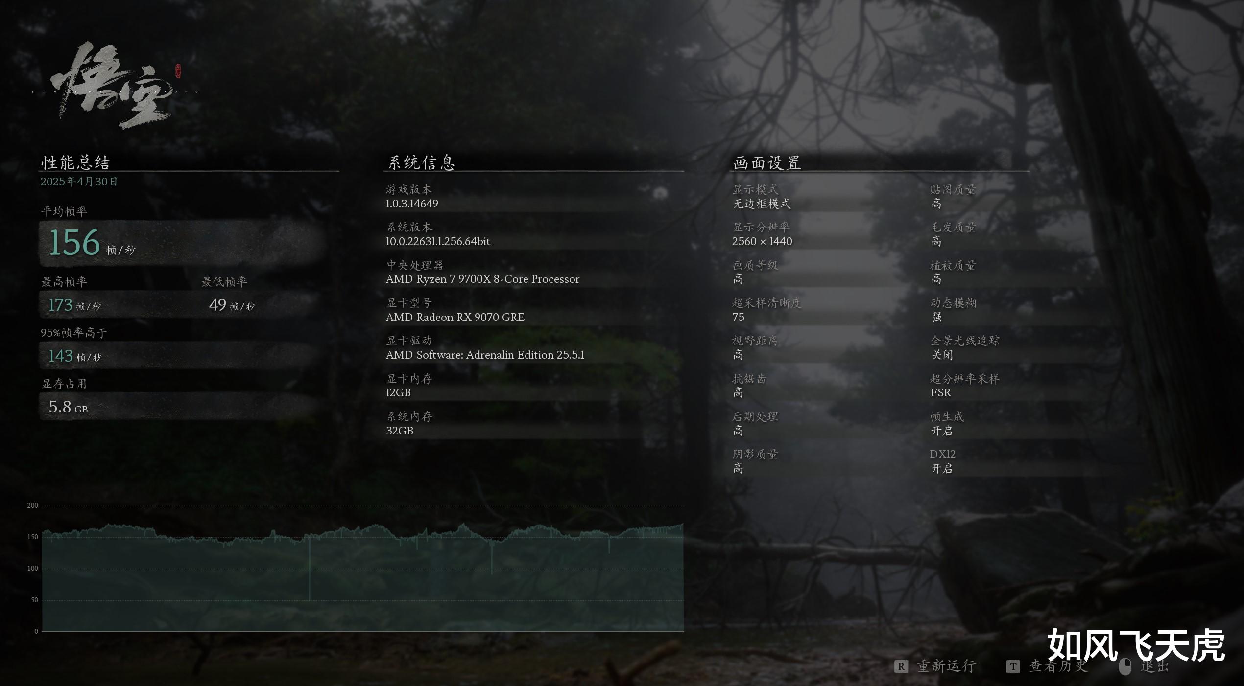 首先是国产3A大作黑神话.悟空,性能测试工具,2K分辨率,推荐的高画质下可达156帧/秒。