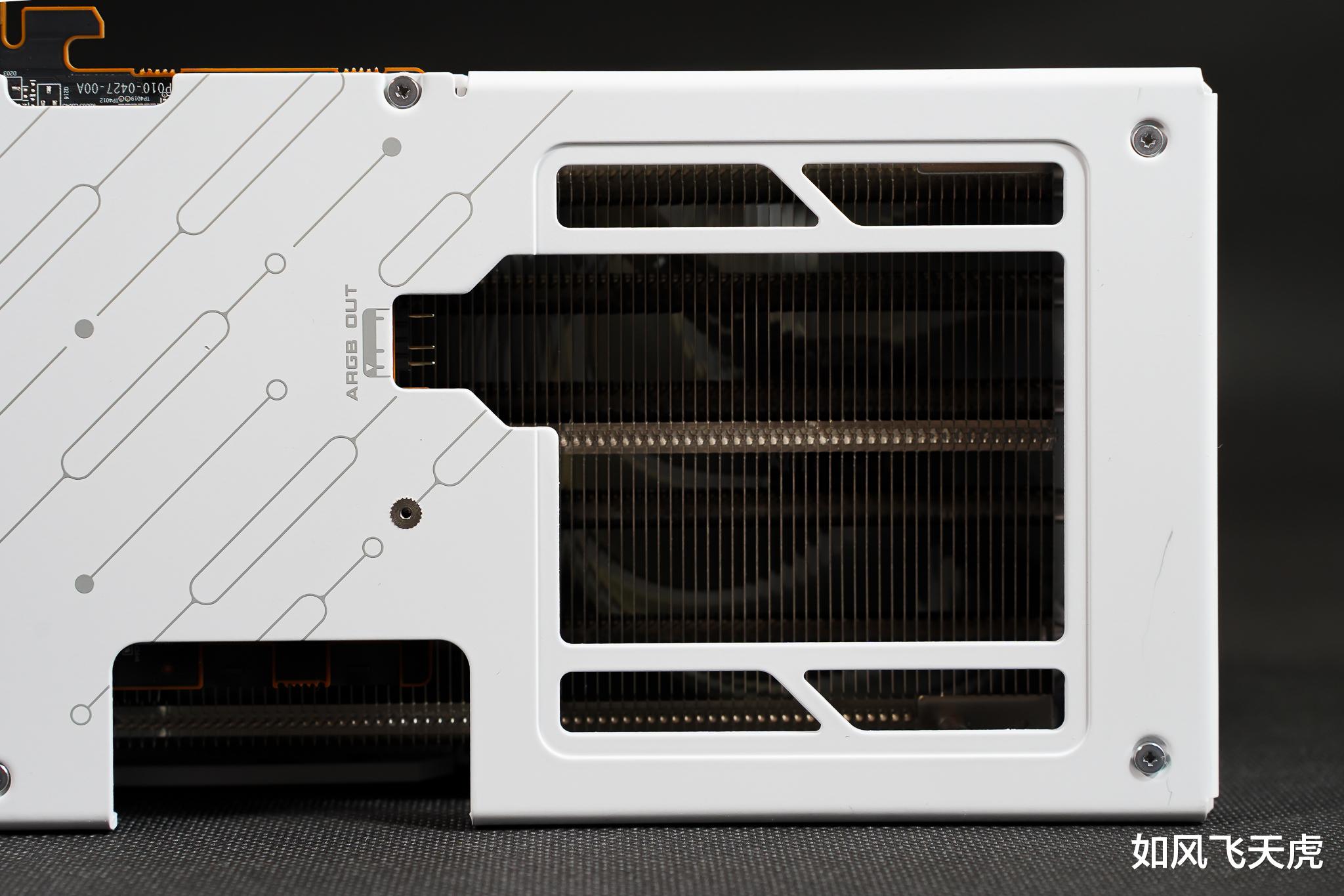 在显卡的右侧可以看到采用了通透式的设计,可以看到大片露出的鳍片,里面隐约可见热管,这种设计可以更有助于热量的扩散。在边上可以看到有ARGB 插针,边上的背板有ARGB OUT的字样,这里可以连接ARGB外接线,然后另外一段连接到主板或者控制器的ARGB接口,实现等效的全局控制。