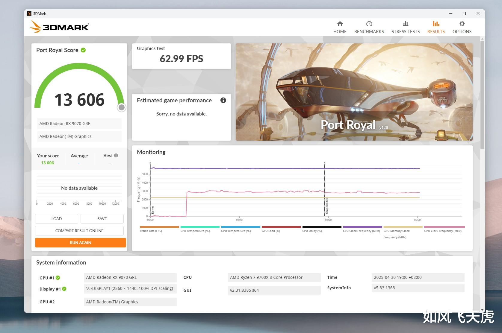 Port Royal 光追测试,13606分,62.99FPS,而网上RTX 5070的评测成绩大多在14300-14400, 蓝宝石PURE极地RX 9070 GRE仅略差一点点,可见一向是弱项的光追功能,在AMD RNNA4上提升很快。