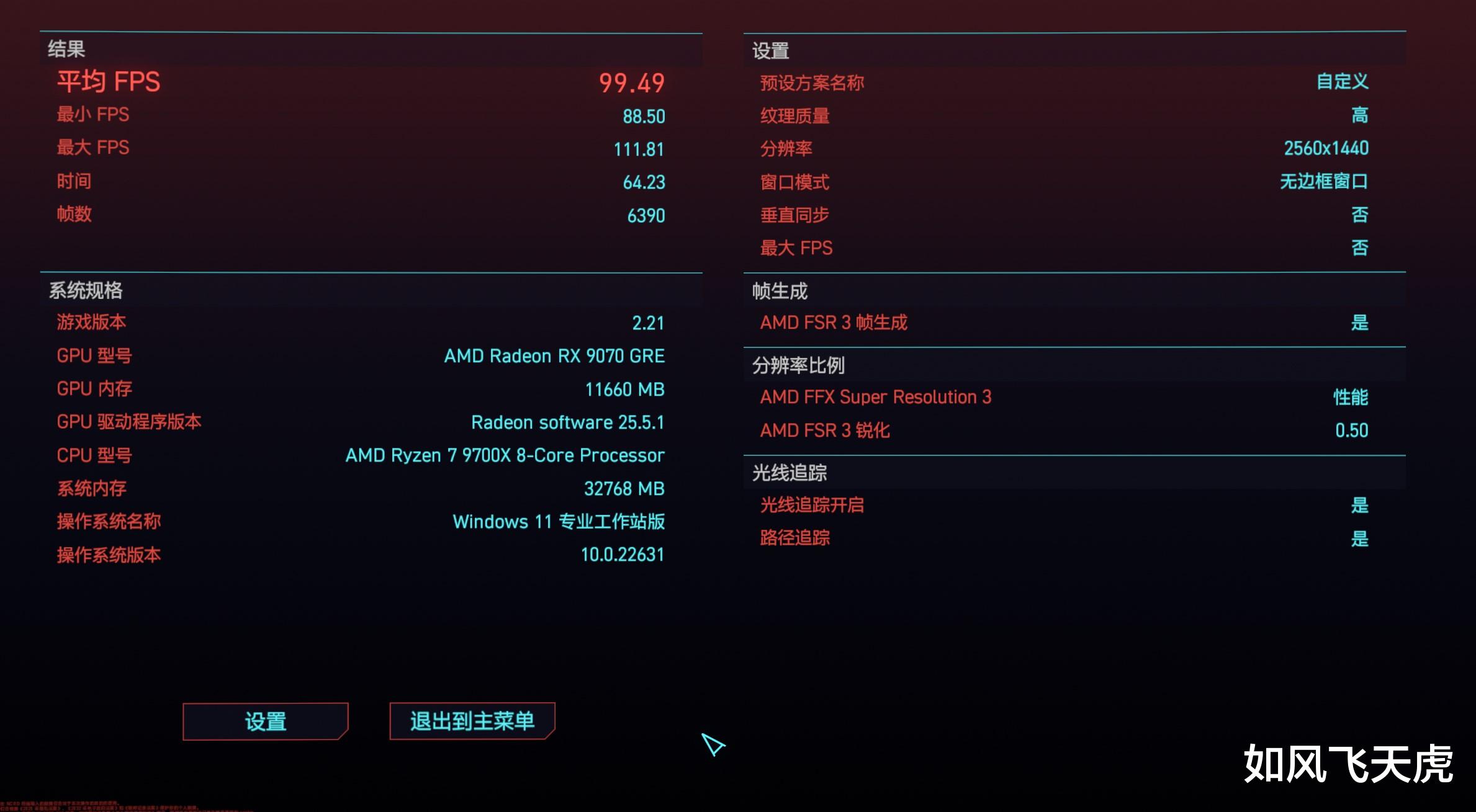 赛博朋克2077,2K分辨率,启用超级光追,启用FSR3,平均FPS 99.49帧,同样畅玩是没有问题的。