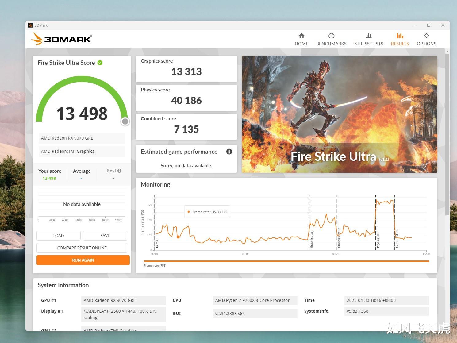 Fire Strike Ultra,总分13498。其中图形分数13313,而网上RTX 5070的评测成绩大多在14300-14700,RTX 5070 略高一点。