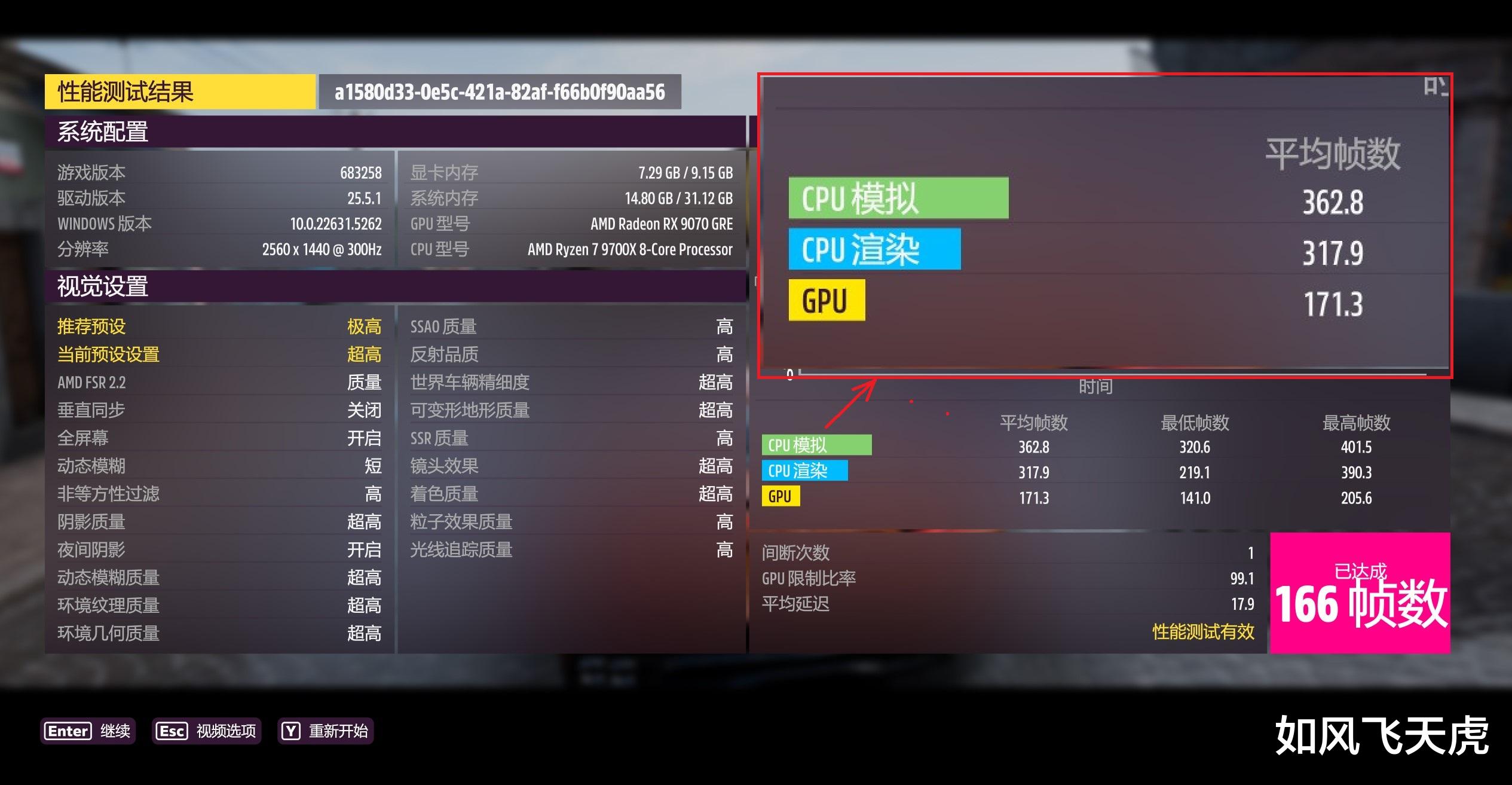 地平线5,最高的极高画质,开启FSR2.2质量模式,达成166帧数。其中CPU模拟362.8帧、CPU渲染317.9帧、GPU 171.3帧,玩游戏毫无压力。