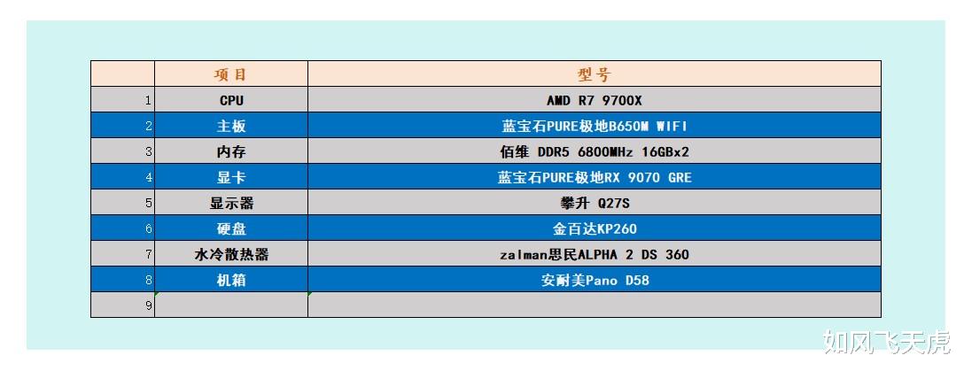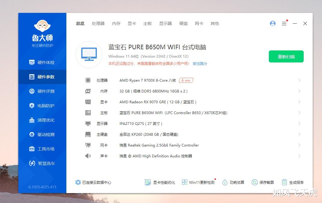 测试电脑的主要配置如上图,CPU是AMD R7 9700X,内存是佰维DDR5 6800MHz 16GBx2,主板是蓝宝石PURE极地B650M WIFI,显示器是攀升Q27S 2K分辨率。