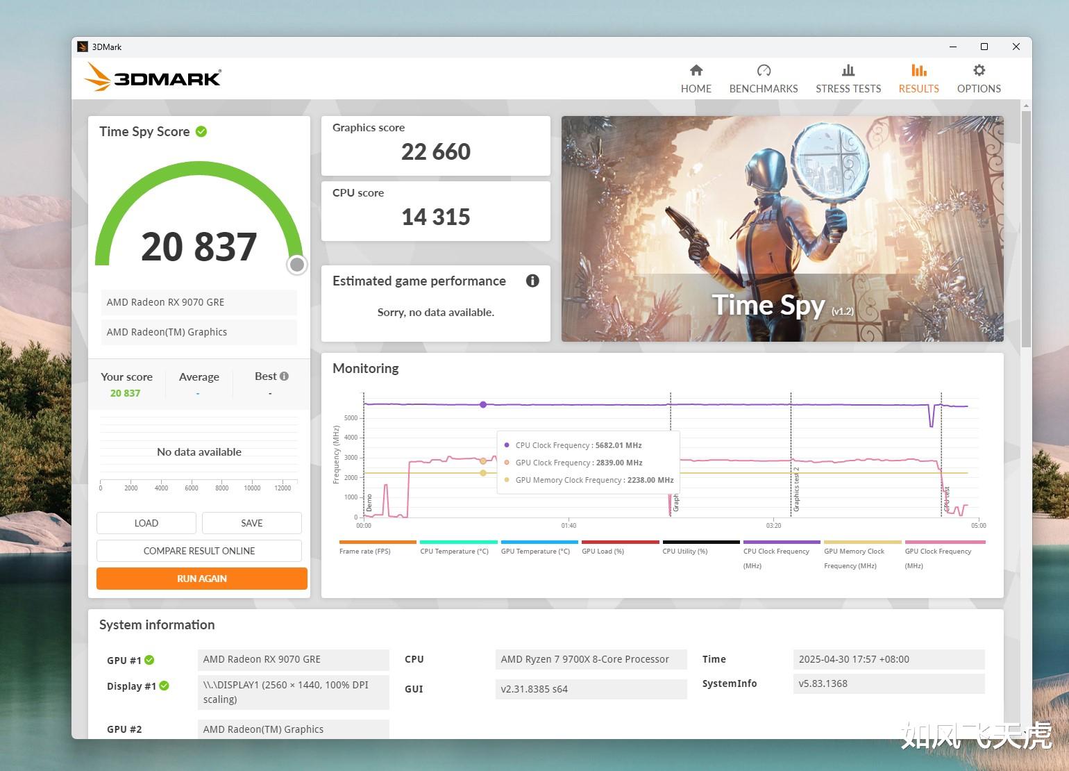 Time Spy测试,总分20837。其中图形分数22660,而网上RTX 5070的评测成绩大多在22400-22700,可谓旗鼓相当。