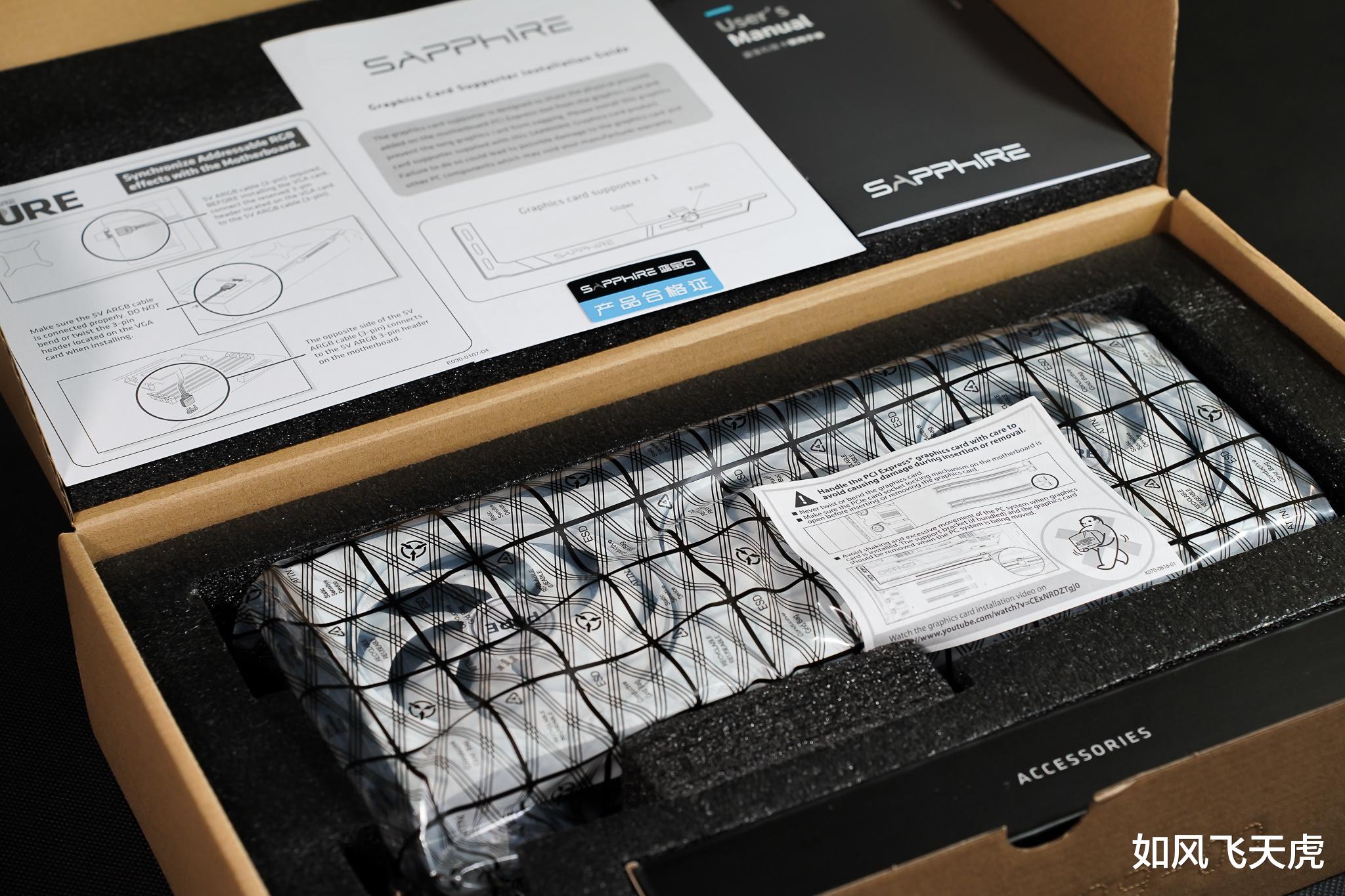 打开盒子,可以看到说明书等纸质资料,蓝宝石特色的硬质质保卡、静电袋包裹的显卡和黑色的配件盒。