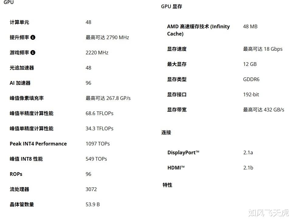 其他一些更具体的参数,游戏频率2220MHz,加速频率可达2790MHz,比RX 9070分别高了150MHz/270MHz。48个光追加速器,96个AI加速器,96个 ROPs光栅处理单元,3072个流处理器(SP)。GDDR6显存,显存速度18Gbps,最大显存12GB,显存位宽192 bit,显存带宽432GB/s。