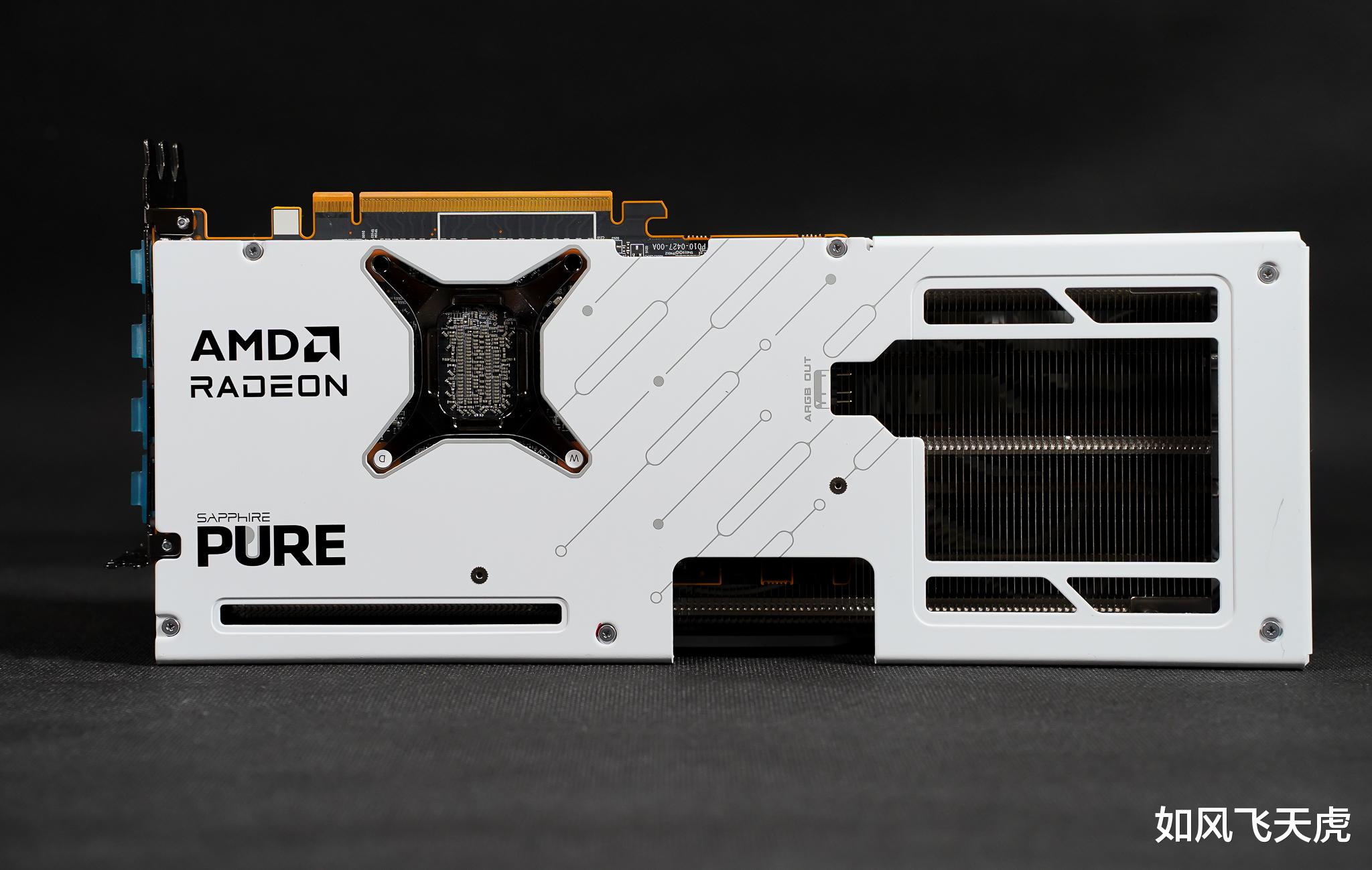 显卡的背面也是白色的,有独特的线条装饰设计。它是全尺寸的金属背板,可以加强显卡强度,并提供更好的散热能力。