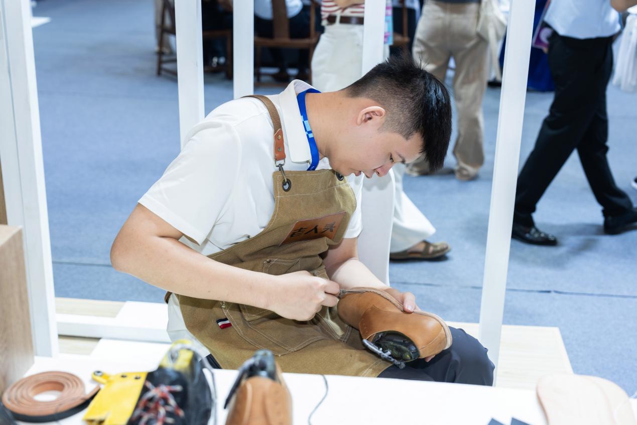 展区还特别设置了非遗传承人制鞋技艺展演,由资深匠人叶奇豪现场示范传统手工制鞋工艺。观众可近距离观赏匠人精工细作的完整流程,亦可现场体验简易皮料缝制,见证百年品牌从手工制鞋到数字化生产的演进历程。
