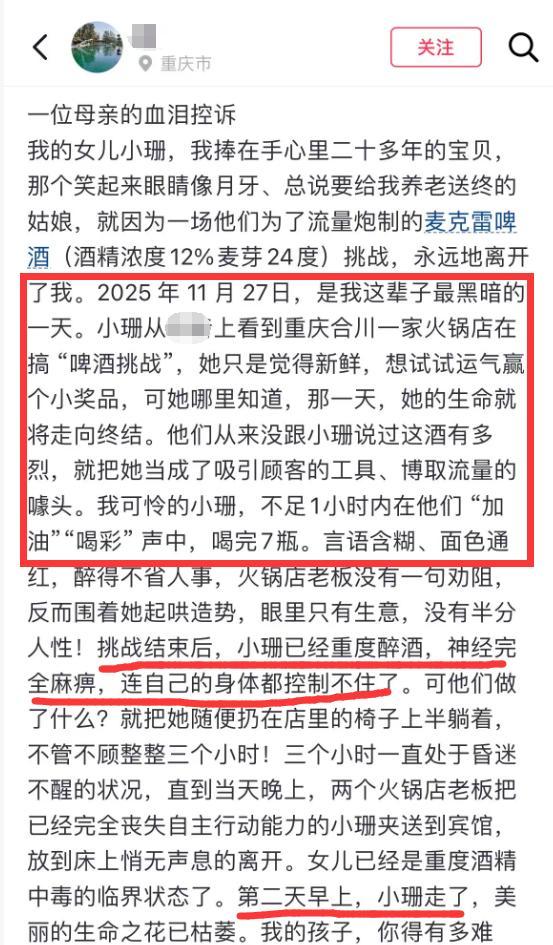 通篇长文字里行间都流露出一位母亲对女儿的刻骨思念,令人痛惜的是,小珊之所以出事,是因为参加了一家火锅店发起的“啤酒挑战”,在不到一小时之内,小姗牛饮7瓶啤酒,随即不省人事,最终因为重度酒精昏迷遗憾离世。