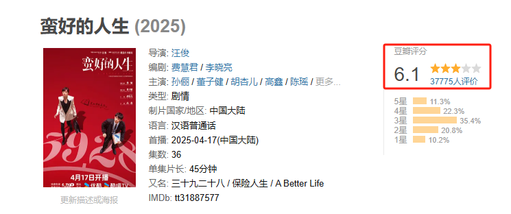 哪怕有孙俪坐镇,也没能挽救这部剧的口碑,从开播起,《蛮好的人生》的豆瓣评论区就是一片差评,评分更是只有6.1,也就勉强才及格。