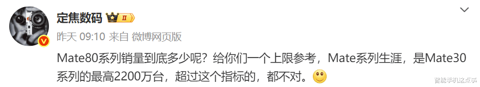但是博主称华为Mate80系列销量还没有达到Mate系列的上限,历史上Mate30系列销量最高达到了2200万台。