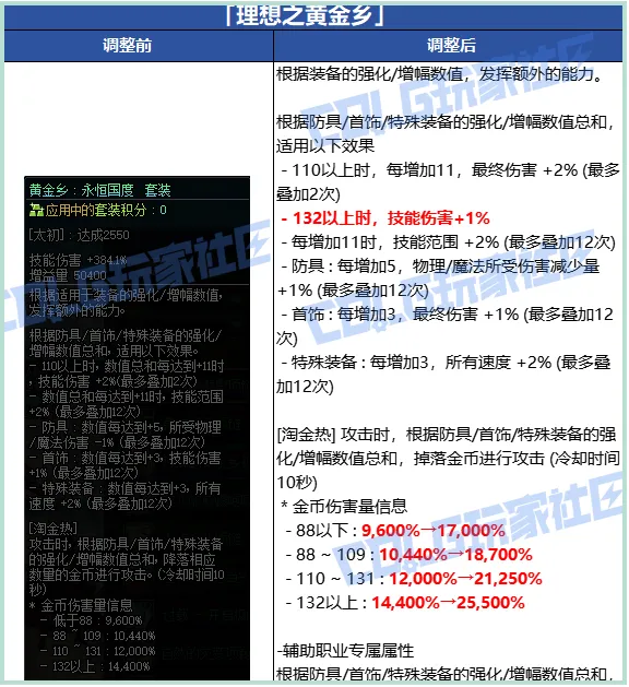 因强化/增幅数值132以上时技攻+1%,让红12黄金乡更上一层楼。