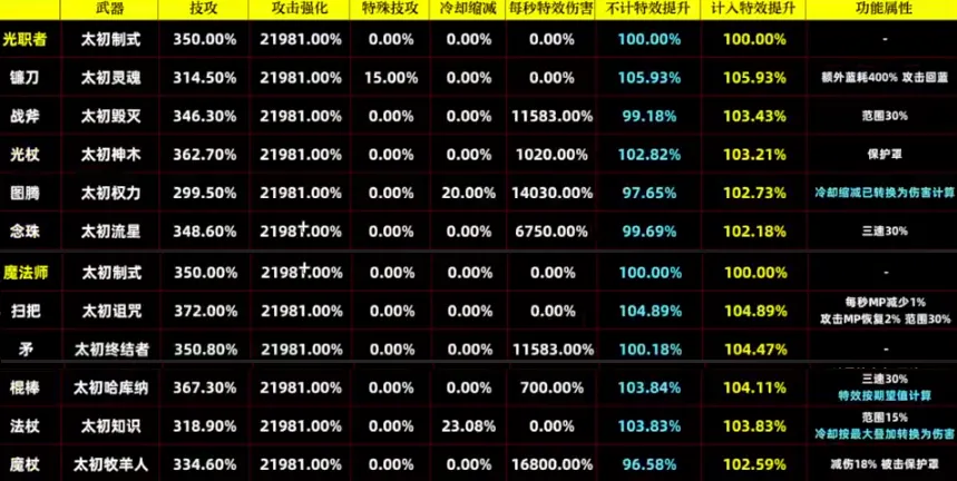 全职业太初传世武器基本进行了调整,“素颜”也进行了相关分析,整理出【不计入特效】和【计入特效】两种强度提升率。