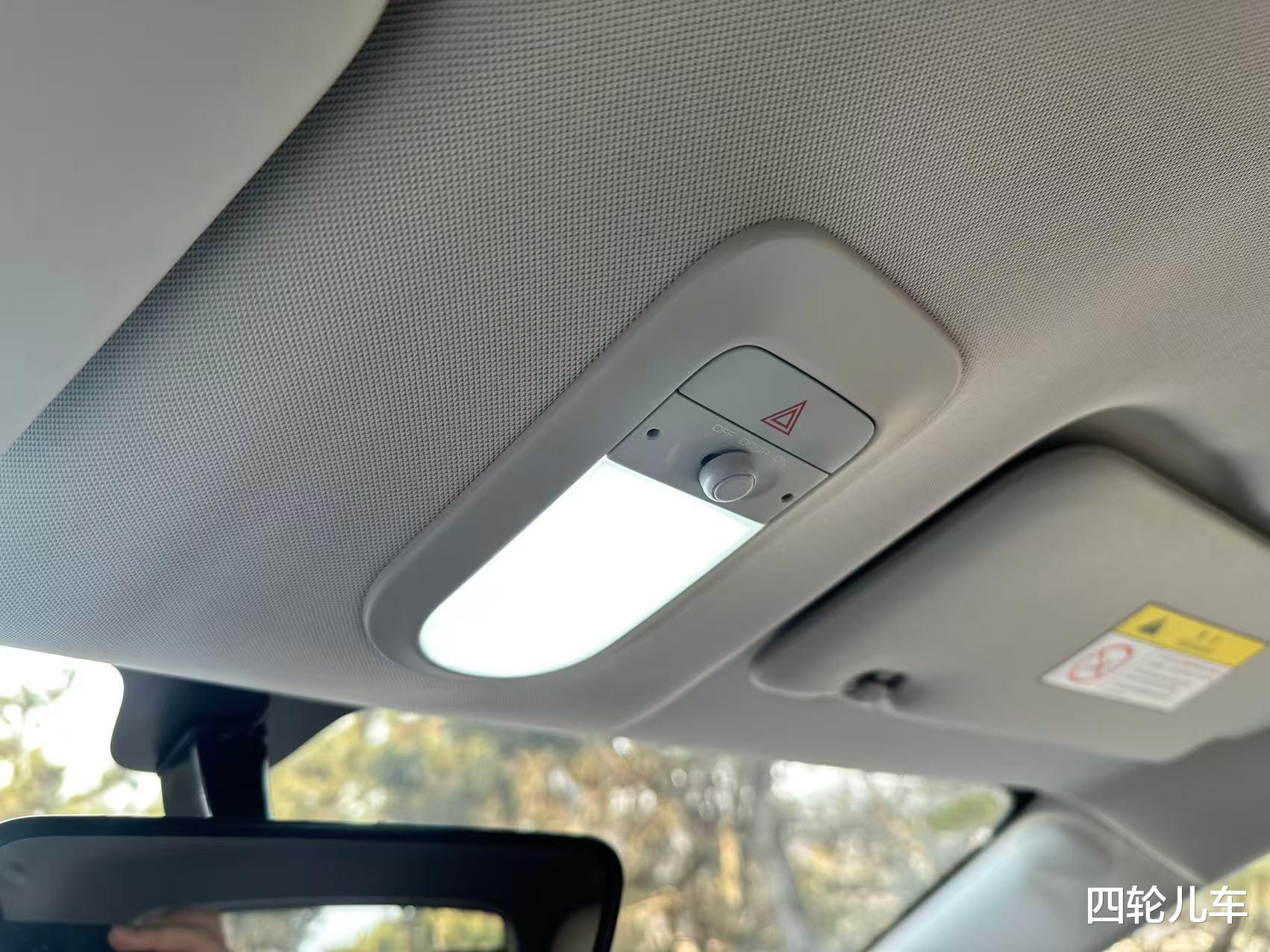 车内照明不足。前排和后备箱分别有一个阅读灯,夜晚打开后无法满足照明需求。建议在后排顶部和后备箱再各加一个照明灯。