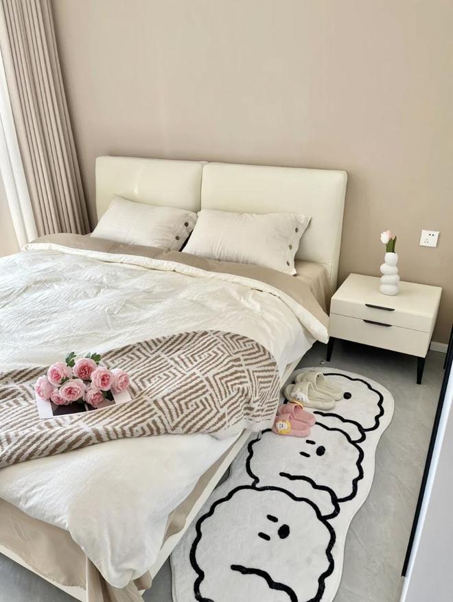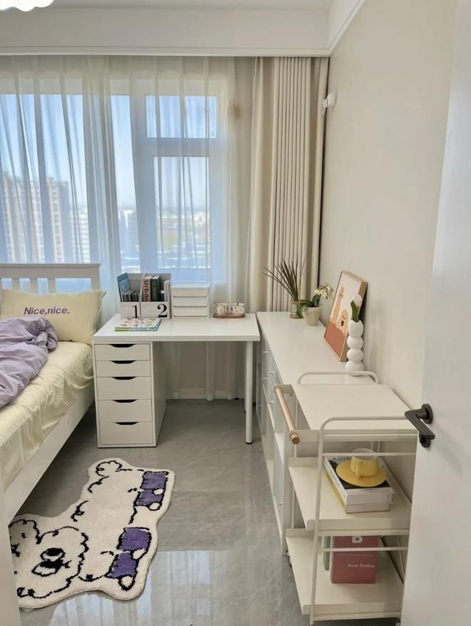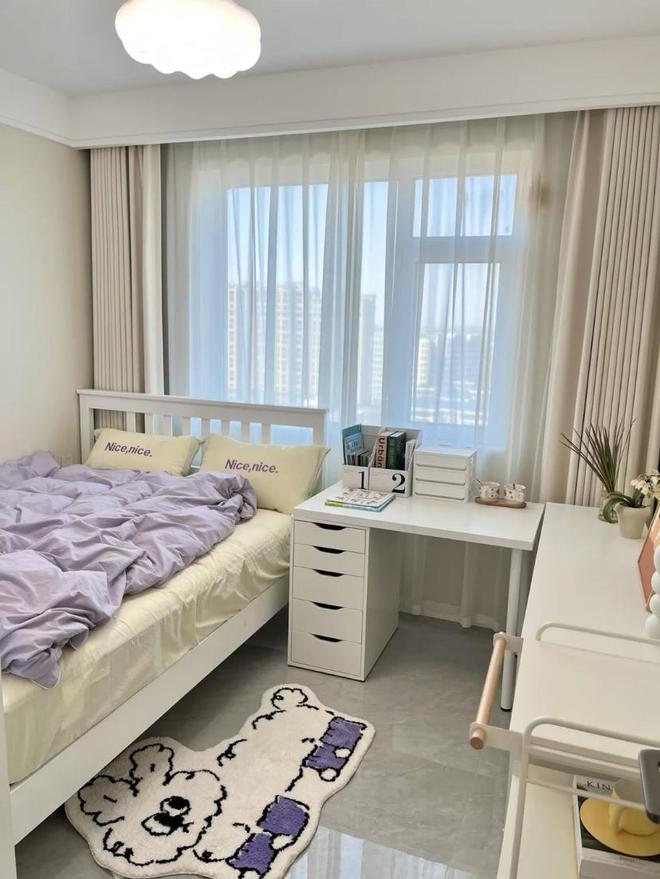 卧室通刷浅色系乳胶漆,比较好搭配,换种搭配色系就是一种风格,选了可爱的马卡龙色系的床上用品,还搭配了同色系的小地毯,女儿坐在床边读书心情也会轻松又美好。