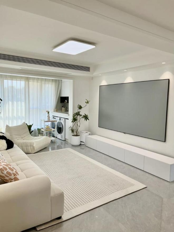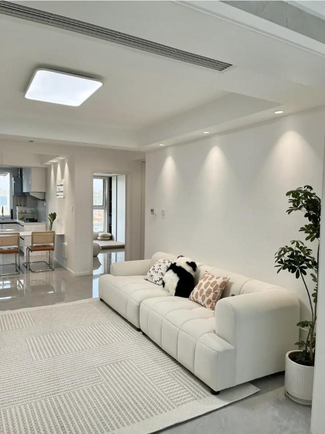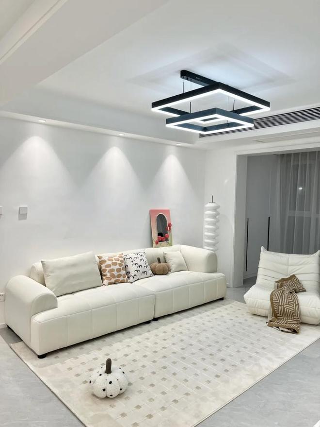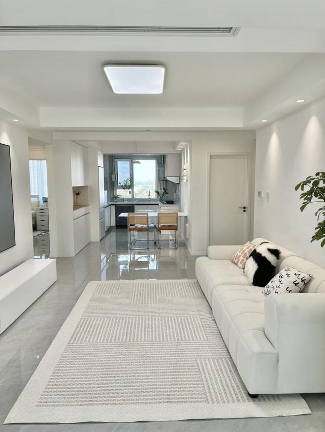 硬装以白色为主,软装颜色就可以自由搭配了,无论是地毯,抱枕、换鞋凳,还是装饰画这些,根据自己喜欢的风格搭配。