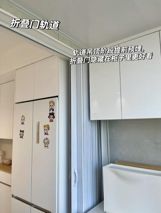 折叠门的轨道是提前预埋的,折叠门隐藏在冰箱柜子的后面,从客餐厅的角度看也看不出来,恍然一看去,都以为厨房是全开放式的。