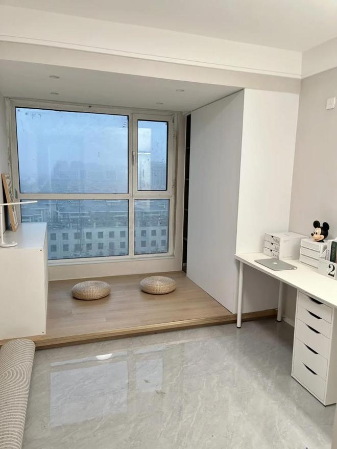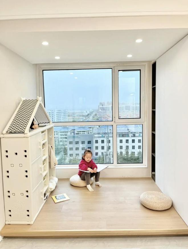 现在大家看到的这个地台,是一个小阳台,把阳台和书房打通,但是打通以后有个高度38cm的梁,所以吊了平顶,做了衣柜。孩子坐在上面看绘本,玩玩具,吃东西,真的很方便。万一哪天真有个客人需要留宿的,睡地台总打地铺强太多。