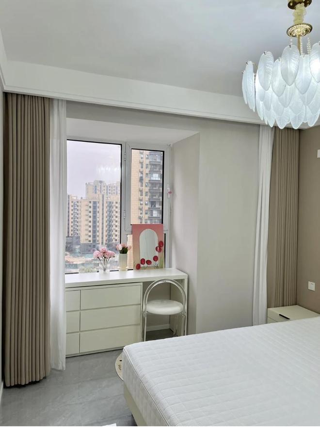 飘窗放了斗柜当梳妆台,真的很好,小户型不放过每一平可以利用的空间,就连会发光的灯都能利用起来当床头柜。