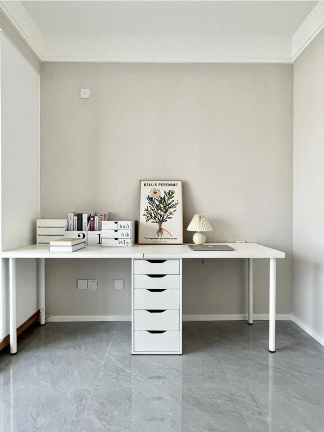 书桌是宜家组装的,长度2m,宽度60cm,高度70cm,由两张1m的桌面,一个抽屉,4根桌腿组成。书桌不管是做孩子的学习桌还是办公桌都很实用,也很好看。