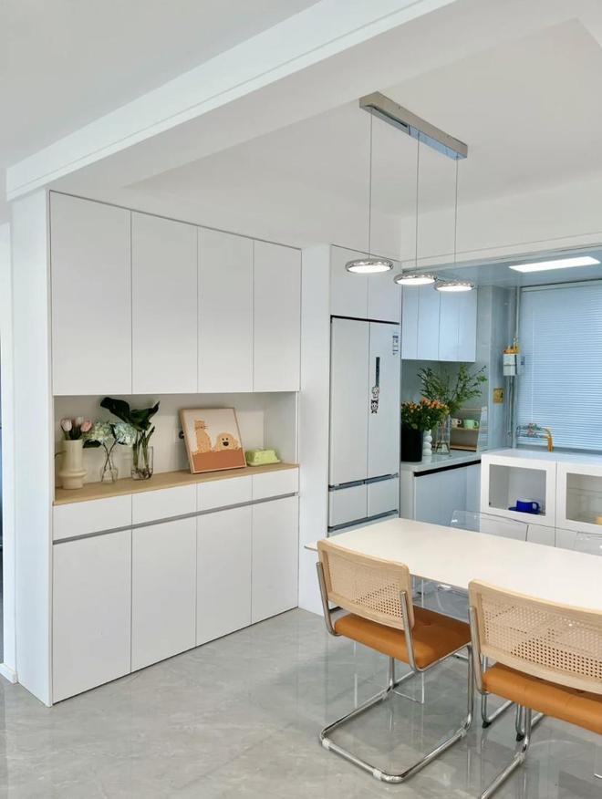 整面墙的餐边柜,一侧是薄一些的收纳柜,一侧是厚一些的冰箱收纳柜,各自满足各自的功能性。餐边柜的台面是原木的颜色,和白色的柜子形成不一样的颜色对比。