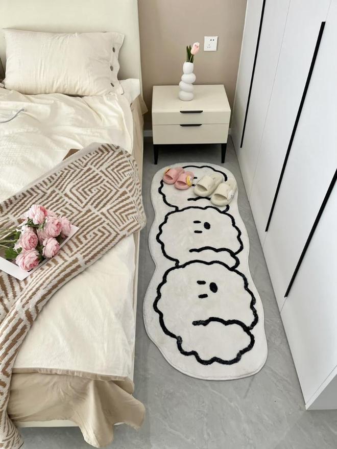 毛绒绒的白色地毯,是三只小狗的造型,特别的可爱,摆放在窗边,脚感特别的棒,踩上去特别舒适,装饰性也很强。