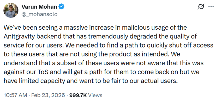 Anthropic就曾更新服务条款,禁止在OpenClaw等第三方工具中使用ClaudeFree、Pro或Max账户的OAuth,将这种行为定性为“token套利”和安全风险。随后,谷歌称检测到自家AI编程工具Antigravity后端出现“大规模恶意使用行为”,严重降低了正常用户的服务质量,连夜封禁OpenClaw。