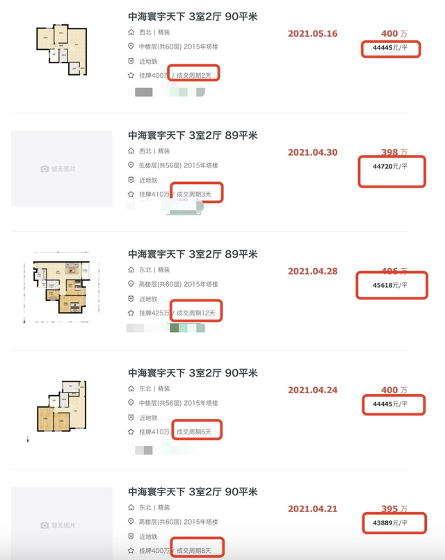 2021年5月,挂牌均价一度冲到5.3万/㎡,成交价稳定4-4.5万/㎡,成交周期也短。