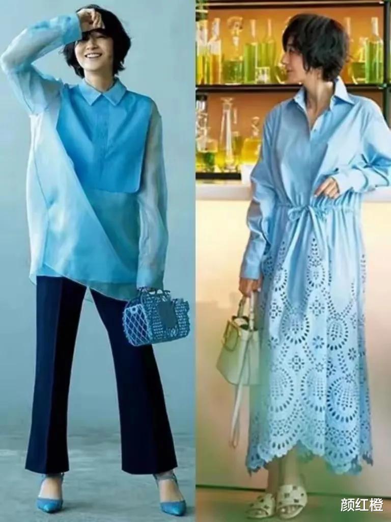 首先,穿衣打扮尽量做到穿松不穿紧,懂得断舍离,如果在这个春季,你想要穿连衣裙,可以借鉴下面这两条衬衫款式的连衣裙,选择的还是浅蓝色的,穿在身上之后修饰肤色显白显嫩显年轻,而且左边的这款是高腰收腰的款式,裙摆是属于伞状的款型,很遮肉。