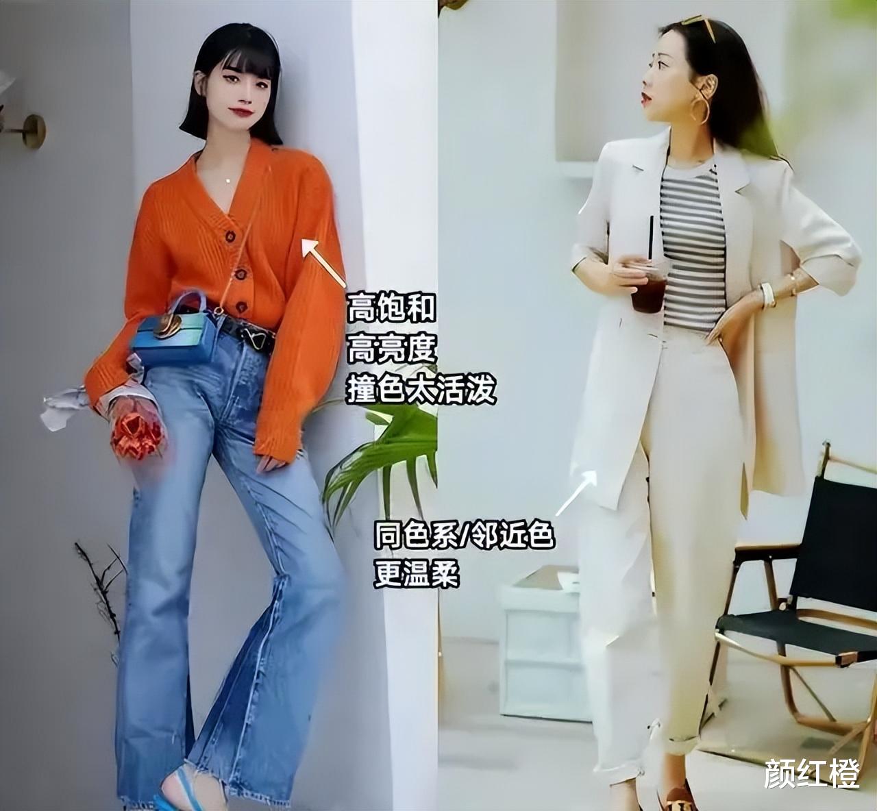 咱们来看下面的这两套穿搭对比搭配的配饰就有个明显的答案了,你选择的是一件浅蓝色的针织开衫,搭配紫色的阔腿裤,但是这样的色彩组合显得有点俗气,廉价,就算你拎的包包很高级,也无法达到点缀的效果。