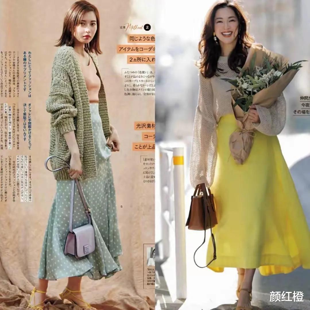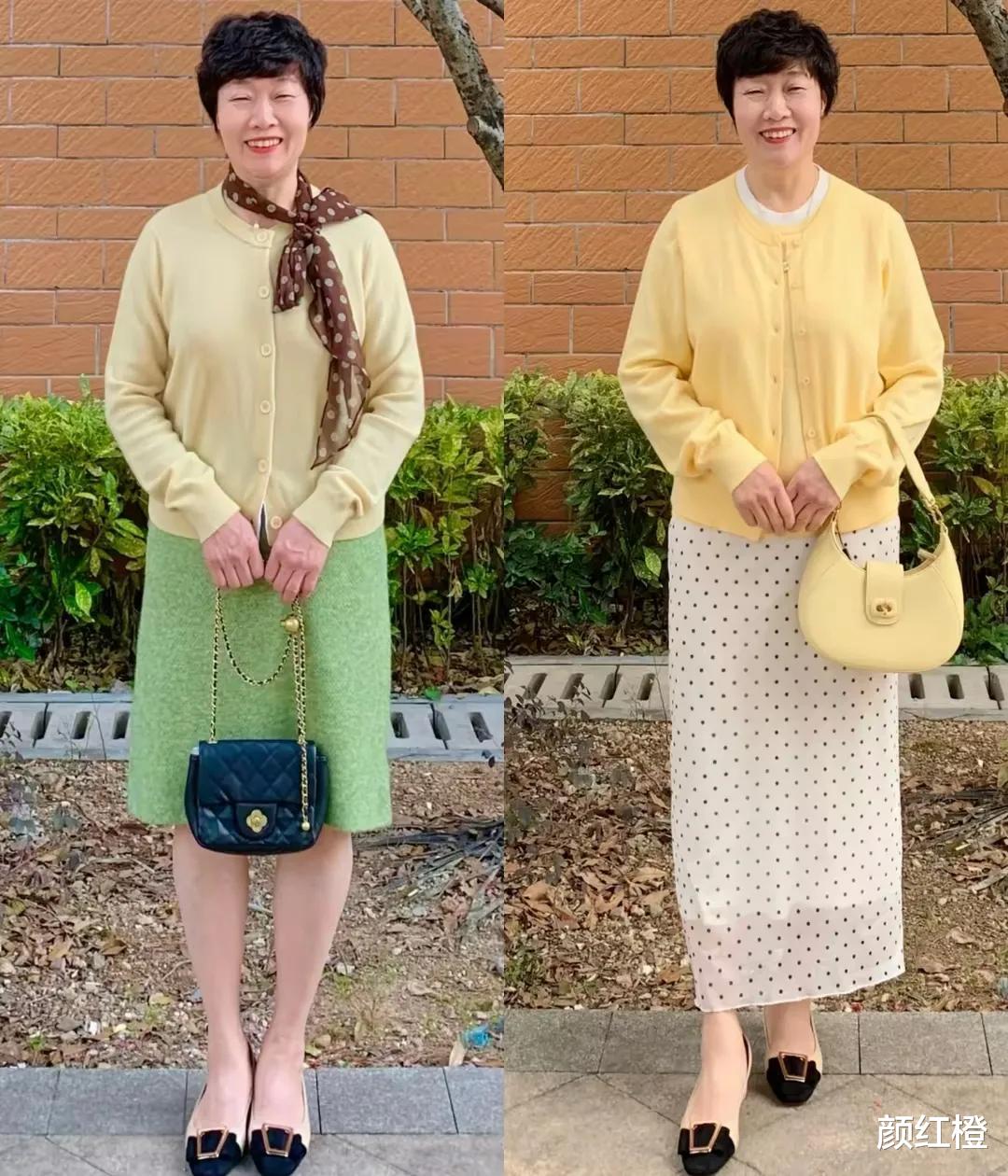 如果你的年龄是在五六十岁,但是肌肤保养的比较好,是属于冷白皮的,也可以尝试彩色系的衣服,例如下面这两件浅黄色的针织开衫,搭配上绿色的直筒半身裙,白色的波点半身裙,脚踩双拼接色的前扣高跟单鞋,呈现出来的效果也显得很时尚又显年轻,同样也很修饰肤色,不会带有违和感,但是皮肤偏暗沉的女性尽量不穿这么亮的衣服单品。