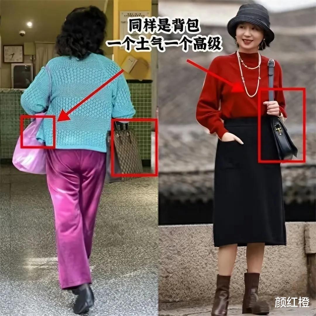 但是你换成了红色的针织上衣,搭配黑色半身裙,再用黑色的单肩包来点缀,同样是背包,但是一个土气一个高级,这就是穿衣配色的妙用。