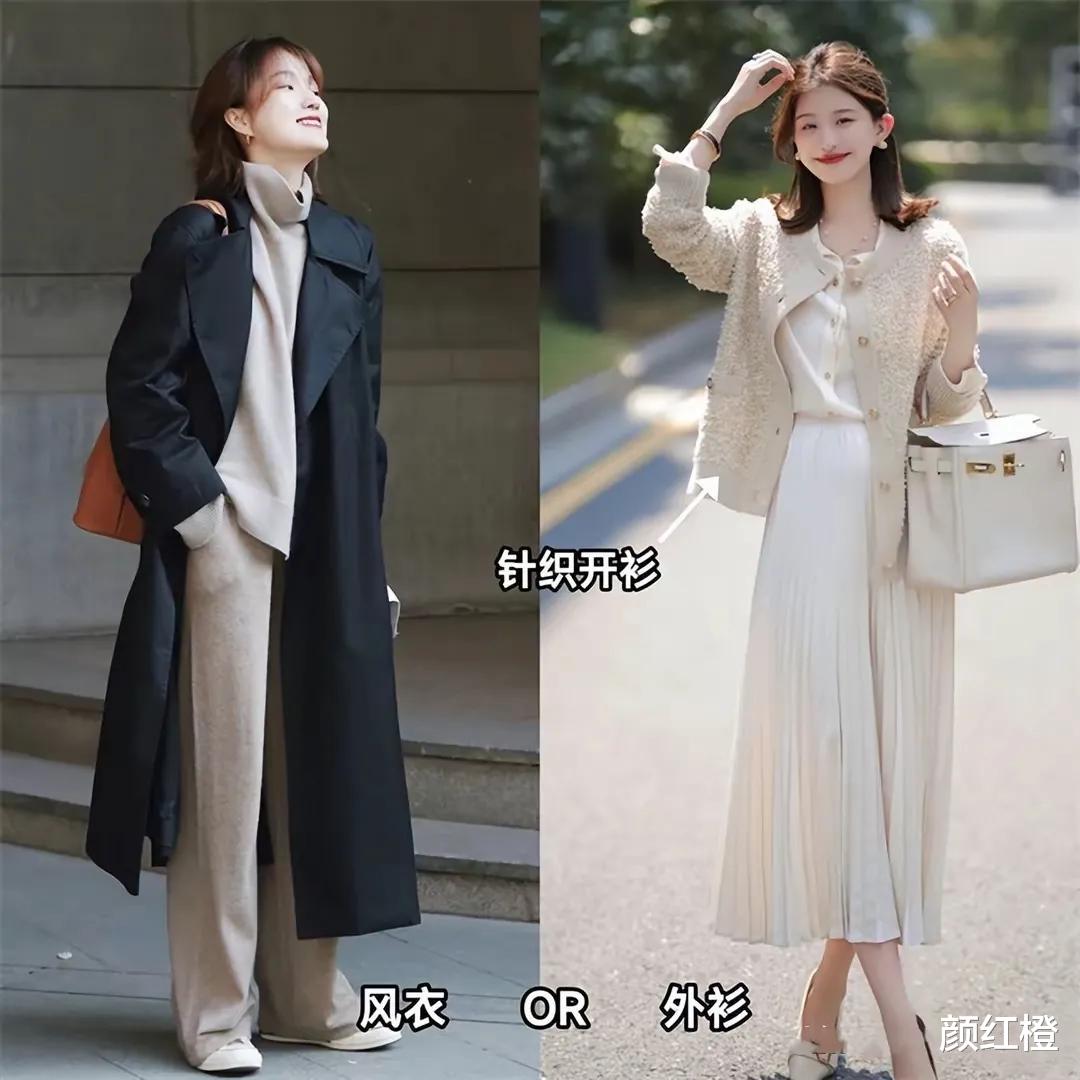 特别是下面右边的这一套穿法,用一件针织开衫内搭一件同样是薄款的白色针织开衫,加上白色的百褶半身裙,这一身穿衣造型就很显贵气,而且优雅大方,有女人味,普通大众照着穿也不会出错。