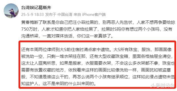 5月9日,葛斯齐发文爆出了一则大瓜,他称大S值钱的那些名贵珠宝和衣物已经被洗劫一空。