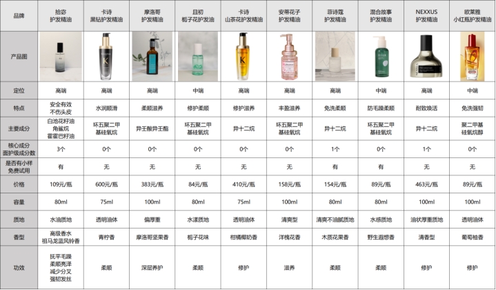 下面是几款护发精油的详细数据: