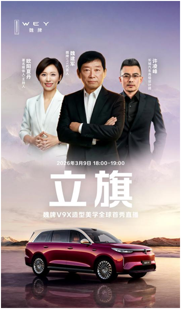 3月9日,魏牌即将上市的“AI豪华六座旗舰”魏牌V9X,于保定开展了一场主题名为“立旗”的造型美学全球首秀直播。