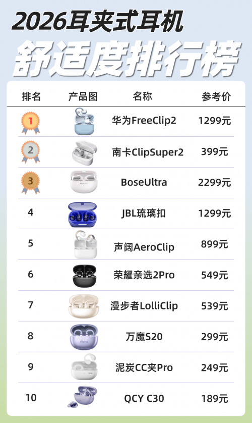 夹耳式耳机的走红,正源于它对耳朵的“友好度”——不用塞进耳道,久戴不闷不痛,还不耽误感知周围声音,不管是日常通勤还是运动健身都很适配。2026年各大品牌纷纷发力这款产品,选择越多,大家越难抉择耳夹耳机哪个品牌更靠谱。这份榜单就聚焦十款优质夹耳式耳机,帮大家快速锁定高性价比之选,告别挑选难题。