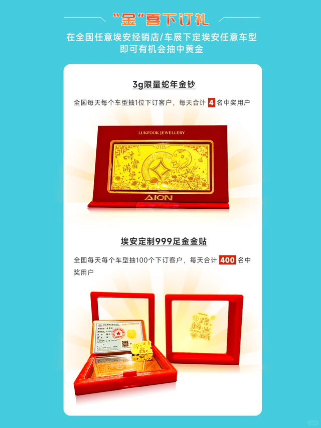 除了全系车型的钜惠政策,埃安黄金品质还送黄金!推出的黄金周抢黄金”活动更是为消费者带来额外惊喜。即日起至5月5日,在全国任意埃安经销店或车展下定任意车型,即可参与“黄金周抢黄金”活动:全国每天每个车型抽1位下订用户送出3g限量蛇年金钞(每天共4位幸运用户)。全国每天每个车型抽取100名下订客户送出999足金金贴(每天共400名中奖用户)。