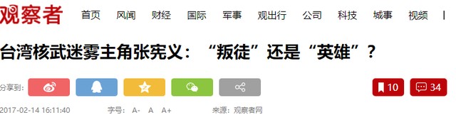 观察者网:台湾核武迷雾主角张宪义:“叛徒”还是“英雄”? 2017-02-14