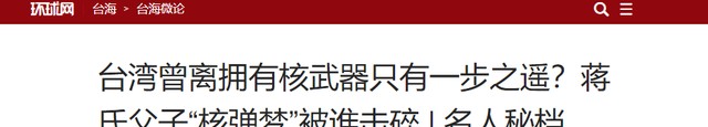 环球网:台湾曾离拥有核武器只有一步之遥?蒋氏父子“核弹梦”被谁击碎 | 名人秘档 2016-11-04