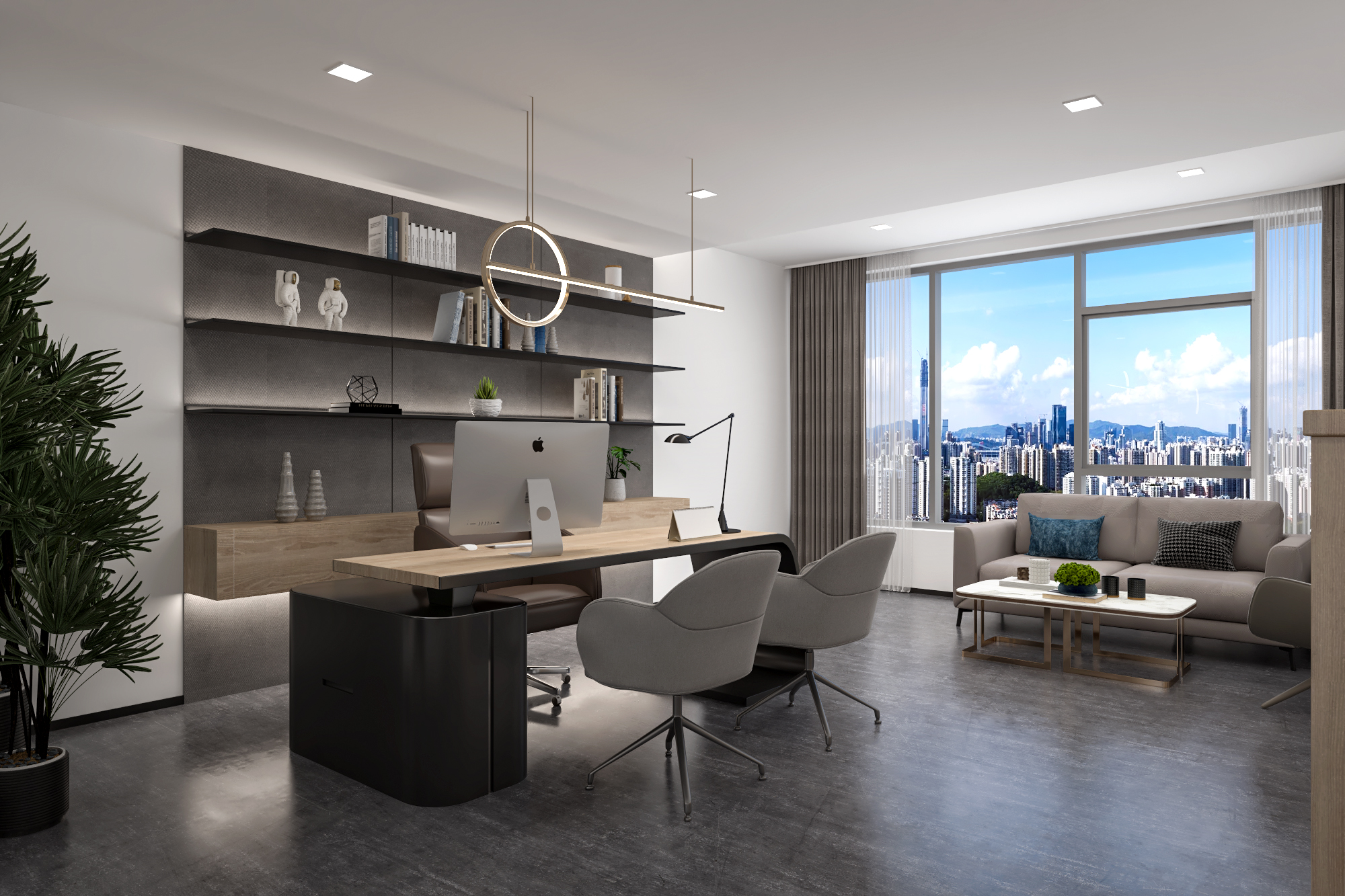它平衡了个人办公与小组讨论的功能。办公桌、会议区、沙发休息区布局分明。书墙与陈列品展示专业积累与个人品味,大面积窗户则象征着视野与格局。这是一个兼具深度思考、小范围决策、以及非正式接待的复合型空间,体现了承上启下的管理角色所需的多任务处理场景。