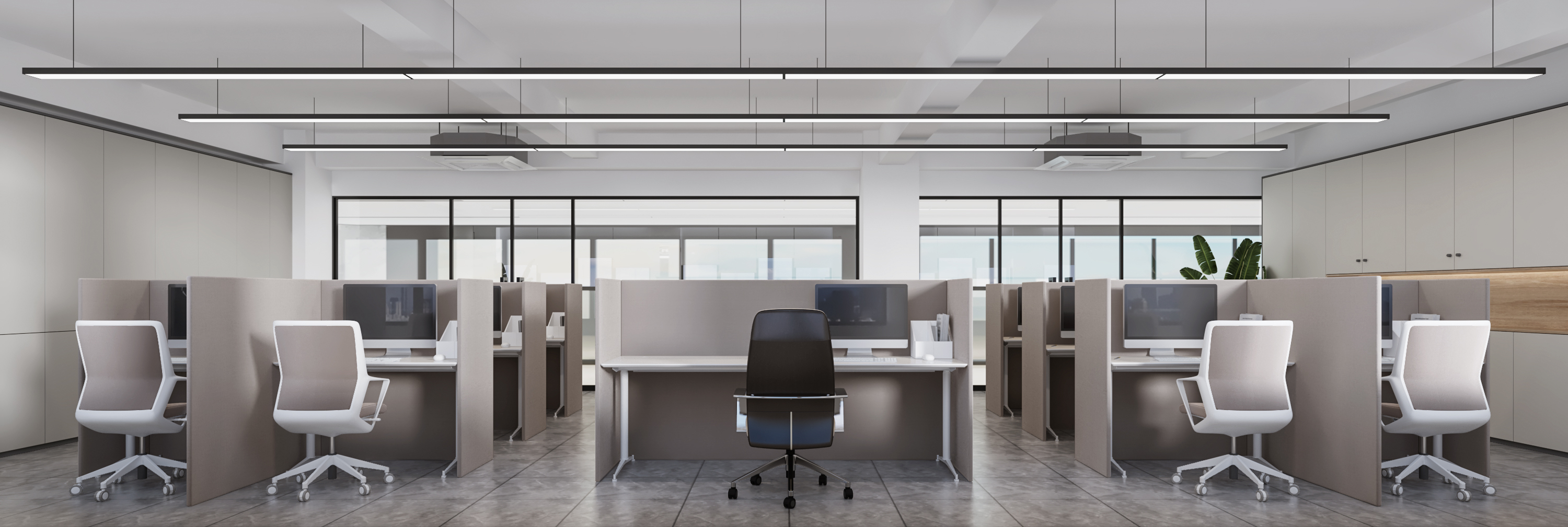 同样是密集的工位,但这里的隔板色调更沉稳,储物功能被强化,整体氛围显得更为内敛和务实。灯光布置规整均匀,确保每个工作单元都获得同等照明。它弱化了个人色彩,突出的是模块化的组合与团队整体的协同输出,一切以流畅、稳定的运作为核心。