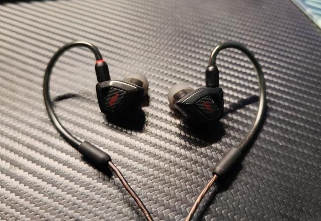 铝镁合金腔体搭配部分碳纤维纹理面板,质感在线。3 对亲肤硅胶耳塞 + 双段式可选,适配多数耳型,狂甩不易掉,但 3-4 小时久戴部分人会略胀耳。